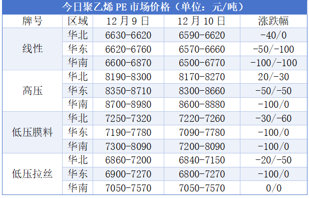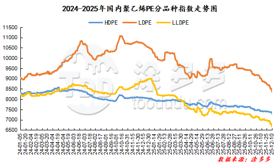 Domestic PE Indices: According to data from TuDuoDuo, on December 10th, the domestic HDPE spot index was 7276, down 48; the LDPE film spot index was 8343, down 58; and the LLDPE spot index was 6670, down 65.