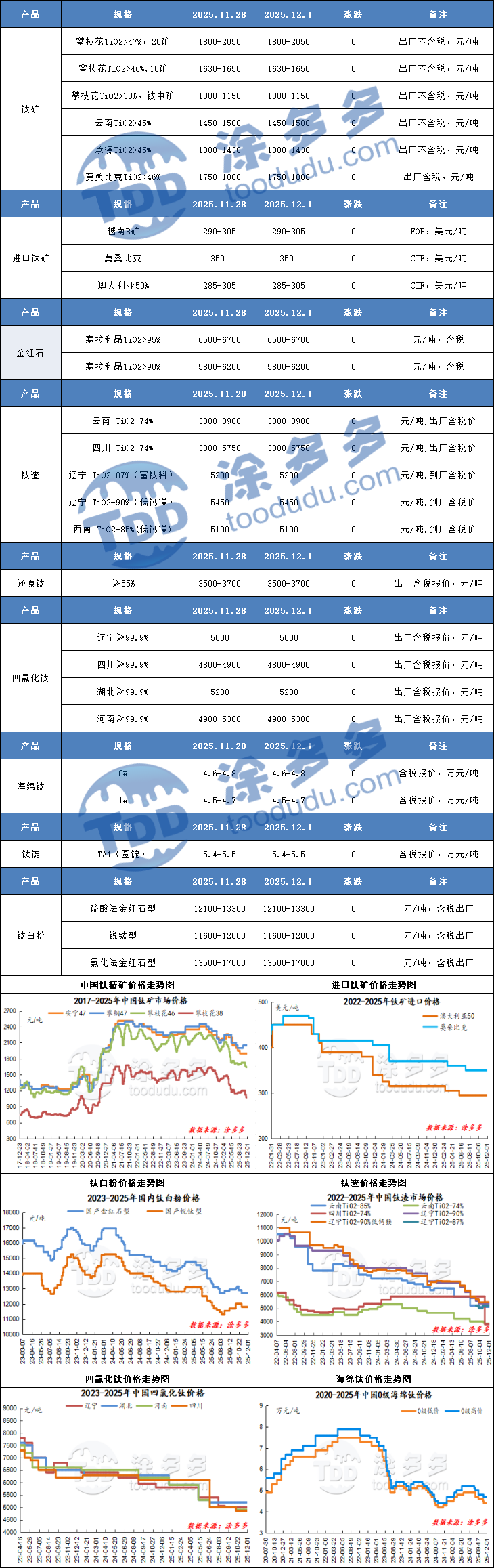 In November, the bidding price for high-titanium slag from northern enterprises was 5450 yuan/ton, an increase of 10 yuan/ton compared to October. The titanium slag market remained weak and stable, with ample supply of high-titanium slag. The market is largely awaiting the results of this month's new round of bidding, with some enterprises hoping for price increases.