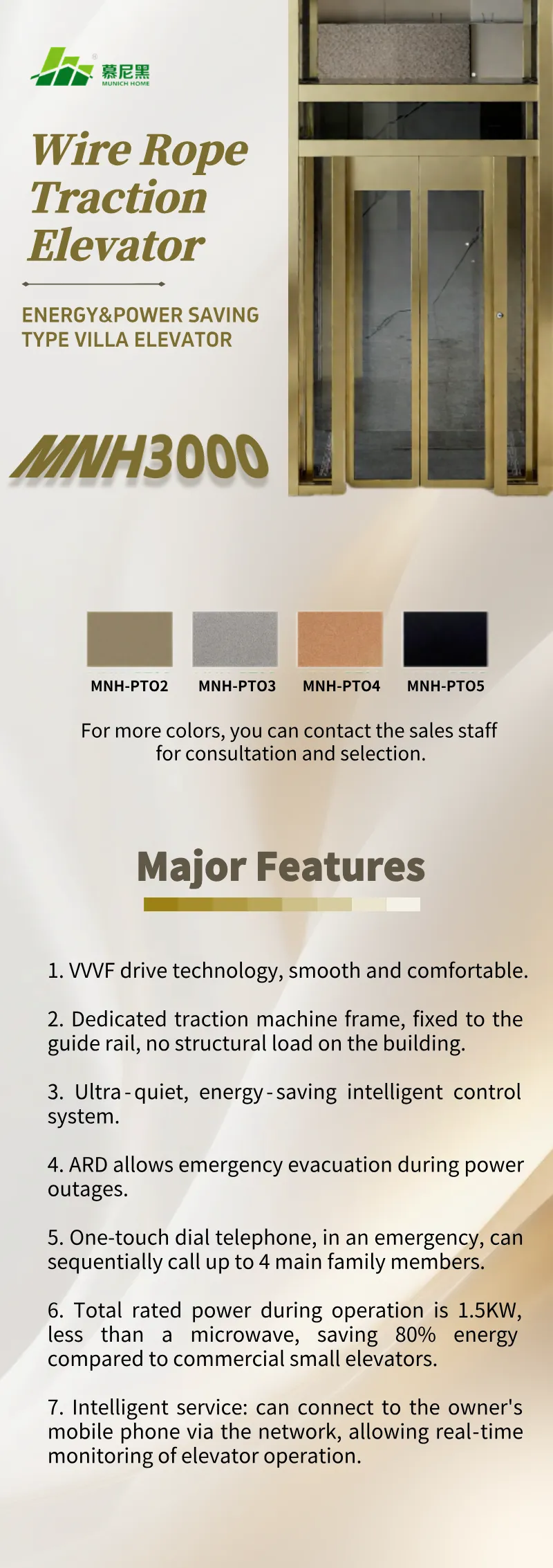 MNH3000, home elevators for villas and lofts, wire rope traction elevators, self-built residential elevators, energy-saving, stable