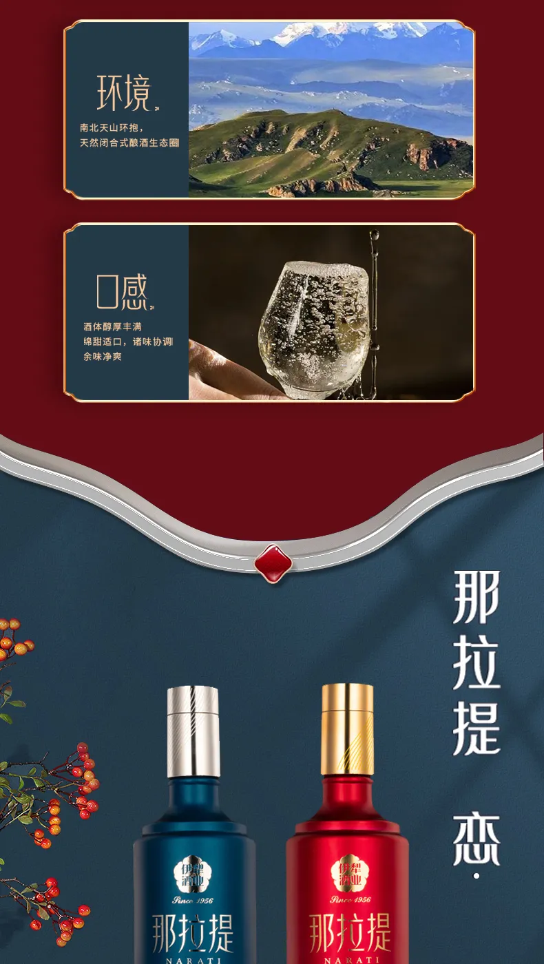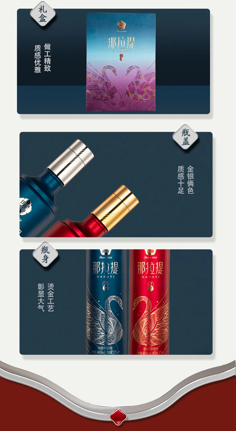 Nalati Love is a double-bottle wedding-themed wine specially crafted by Yili Wine Industry. When the two bottles are placed close together, two swans symbolizing love will form a romantic heart shape. The design is exquisite and the meaning is beautiful. Nalati Love has a pure and long-lasting wine body, a soft and comfortable taste, and a sweet aftertaste.