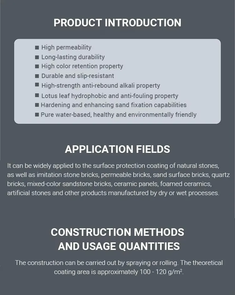 The main application areas of the product are: PC imitation stone brick, permeable brick, sand brick, quartz brick, sandstone brick, new and old cement floor, new and old cement wall, cement pipeline, cement prefabricated board, red brick, gray brick, calcium silicate board and other cement-based surface protection;Suitable for surface coating protection of all ceramic tiles, antique tiles, rock slabs, artificial stones, natural stones, and other materials.